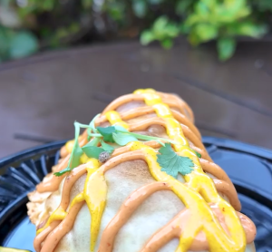 Served with turmeric and annatto aioli, this dish is located between Morocco and France. This empanada is highlighted as a top savory dish at the festival.